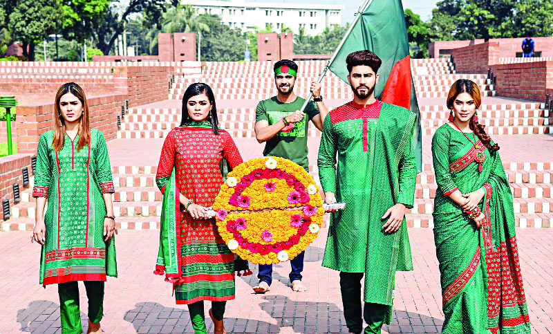 পোশাকে বিজয়ের লাল-সবুজ পোশাকে চেতনা ধারণ করার ভাবনাটি নতুন নয়। দুটি রঙের মিশেলে দেশের জন্য ভাবনাকে ফুটিয়ে তুলতে পারা যায় অনায়াসে। তবে পোশাকের নকশা, কাট, ডিজাইন যেমনই হোক, লাল-সবুজ মানেই একটি চেতনা। সব পরিচয় ছাপিয়ে যেখানে বড় হয়ে ওঠে নিজেদের বাংলাদেশি পরিচয়টাই। তাই প্রতিবারের মতো এবারও দেশীয় হাউসগুলো সেজেছে লাল-সবুজে। বিস্তারিত লিখছেন নিশাত তানিয়া লাল-সবুজ রঙটি আজও আমাদের চেতনার প্রতীক, বলছিলেন রঙ বাংলাদেশের কর্ণধার সৌমিক দাশ। এবারও তারা আয়োজন করেছেন বিজয় উৎসবের। এবারের থিম মানচিত্র, পতাকা ও জাতীয় সংগীত। তিনি আরও বলেন, লাল ও সবুজের সমন্বয়ে প্রতিটি পোশাক যেন কথা বলে আত্মবিশ্বাসের, গর্বের, স্বাধীনতার। কটন হাইব্রিড, জ্যাকেট কটনের আরামদায়ক পোশাক রেখেছেন তারা যে কোনো বয়সের ক্রেতাদের জন্য। স্কিন আর ডিজিটাল প্রিন্টের কাজে প্রতিটিতে থাকছে নানন্দিকতার ছোঁয়া। বাংলাদেশের উৎসব আর দিবসভিত্তিক পোশাকে বিজয় দিবস উল্লেখযোগ্য। তাই তো ফ্যাশন হাউসগুলোর ভাবনায় একঘেয়েমি থেকে বেরিয়ে সময়োপযোগী করার তাগিদ থাকে প্রতিটি বিজয় উৎসবেই। এবারও এর ব্যতিক্রম নয়। বরাবরই ফ্যাশন হাউসগুলো নতুন প্রজন্মকে পোশাকের দিক থেকে করেছে স্বদেশমুখী। তাদের ডিজাইনের একটা বড় অংশজুড়ে রয়েছে দেশাত্মবোধের চেতনা। এবারের বিজয় দিবসে লাল-সবুজের প্রত্যয়ে আবারও সে চেষ্টাই চলছে। মূলত ফ্যাশনের ধারাটা সময়কে ধারণ করে। ফ্যাশন হাউসগুলো ঘুরে দেখা গেল বিজয় দিবস উপলক্ষে ডিজাইন করা শাড়িতে জাতীয় পতাকার লাল-সবুজ রঙের পাশাপাশি আছে কালো, সাদা ও কমলারও নিপুণ সমন্বয়। ফ্যাব্রিক হিসেবে এখানে ব্যবহার করা হয়েছে ক্রেপ সিল্ক ও হ্যান্ডলুম কটন বা হাতে বোনা সুতি কাপড়। ১৯৭১-এর ১৬ ডিসেম্বরের বিজয় এখন ফ্যাশন স্টাইলের অনুষঙ্গ হিসেবে যোগ করেছে নতুন মাত্রা। এ ফ্যাশন-স্টাইলে উৎসবী আমেজ থাকলেও তার থেকে বেশি থাকে দেশাত্মবোধ তথা দেশপ্রেম। আর সে কারণেই বিজয়, স্বাধীনতা কিংবা ভাষা দিবসের ফ্যাশনের প্রথম চিত্রকল্প হিসেবে পোশাকে, শোপিসে কিংবা গহনায় উঠে আসে মুক্তিযুদ্ধের স্থিরচিত্রের চিত্রকর্ম, ’৭১-এর আত্মত্যাগের বাঙালি ধরনটা যেমন হৃদয়ছোঁয়া, মর্মস্পর্শী, আবেগঘন; তেমনি আনন্দময়তার রেশটাও কম নয়। আর এ ফ্যাশন বোধের মর্মকথাটা চিত্রে ও কবিতার পঙ্্ক্তির মাধ্যমে পোশাকে উৎকীর্ণ করার সফল প্রয়াসটা প্রতিবছরের এ বিশেষ দিনগুলোতে করে থাকেন প্রতিষ্ঠিত হাউসগুলোর পক্ষে নিজ নিজ ডিজাইনাররা। এবারের বিজয় দিবসও এর ব্যতিক্রম নয়। মুক্তিযুদ্ধবিষয়ক ডাকটিকিট, মুক্তিযুদ্ধবিষয়ক কবিতা, ছবি, আমাদের জাতীয় ফুল শাপলা ও স্মৃতিসৌধ এবারের আয়োজনের অনুপ্রেরণা হিসেবে ব্যবহৃত হয়েছে। আমাদের প
