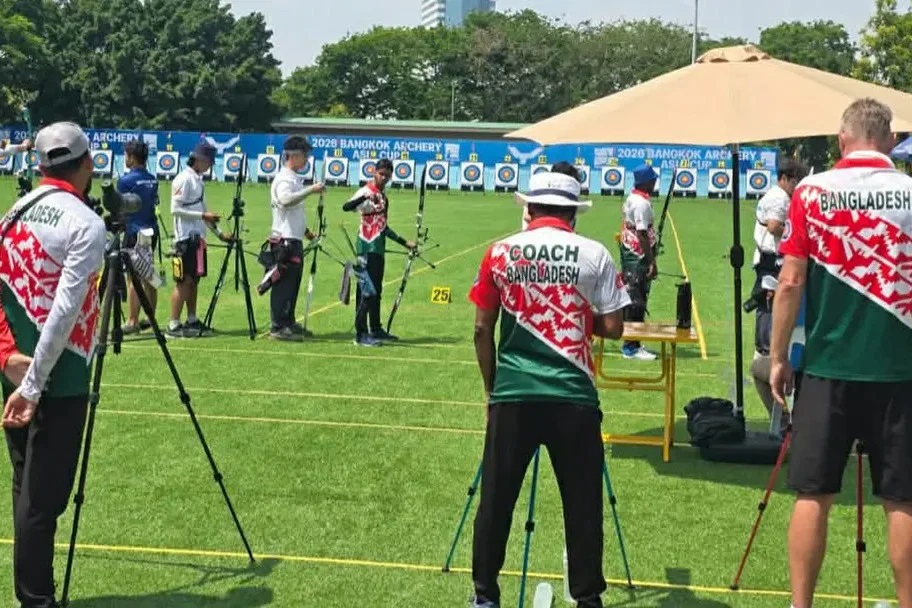 টাইব্রেকারে হার, আর্চারিতে মিশ্র বিভাগে বাংলাদেশের বিদায় এশিয়া কাপ ওয়ার্ল্ড র্যাঙ্কিং টুর্নামেন্টে (স্টেজ-১) মিশ্র বিভাগে হতাশা নিয়েই দিন শেষ করেছে বাংলাদেশ। আজ অনুষ্ঠিত ম্যাচগুলোতে কম্পাউন্ড ও রিকার্ভ দুই বিভাগেই সেমিফাইনালে উঠতে পারেনি লাল-সবুজের প্রতিনিধিরা। রিকার্ভ মিশ্র দলগত ইভেন্টের ১/৮ ফাইনালে মো. রাকিব মিয়া ও সোনালী রায় জুটি ০-৬ সেটে কাজাখস্তানের কাছে হেরে বিদায় নেয়। অন্যদিকে কম্পাউন্ড মিশ্র দলগত ইভেন্টের কোয়ার্টার ফাইনালে নেওয়াজ আহমেদ রাকিব ও মোসা. কুলসুম আক্তার মনির ম্যাচটি ছিল বেশ প্রতিদ্বন্দ্বিতাপূর্ণ। নির্ধারিত সময়ে উভয় দলই ১৫৪-১৫৪ স্কোরে সমতায় থাকে। পরে টাইব্রেকে প্রত্যেক দল একটি করে তির ছোড়ে। এতে বাংলাদেশ ১৮ এবং সিঙ্গাপুর ২০ স্কোর করলে ২ পয়েন্টের ব্যবধানে হেরে যায় বাংলাদেশ। ফলে সিঙ্গাপুর সেমিফাইনালে জায়গা করে নেয়। উল্লেখ্য, গত আসরে রিকার্ভ ব্যক্তিগত ইভেন্টে স্বর্ণ জিতেছিলেন আব্দুর রহমান আলিফ। তবে এবারের আসরে এখন পর্যন্ত কোনো ইভেন্টেই সেমিফাইনালে উঠতে পারেনি বাংলাদেশ। তবে আশা জাগাচ্ছে কম্পাউন্ড পুরুষ দল। আগামীকাল সকালে ভিয়েতনামের বিপক্ষে স্বর্ণপদকের লড়াইয়ে নামবে বাংলাদেশ।