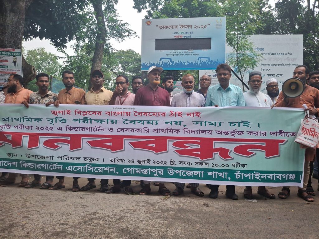 গোমস্তাপুরে বৃত্তি পরীক্ষায় অংশগ্রহণের দাবিতে মানববন্ধন চাঁপাইনবাবগঞ্জের গোমস্তাপুরে বেসরকারি প্রাথমিক ও কিন্ডারগার্টেন স্কুলের ৫ম শ্রেণী পড়ুয়া শিক্ষার্থীদের বৃত্তি পরীক্ষায় অংশগ্রহণের দাবিতে মানববন্ধন অনুষ্ঠিত হয়েছে। বৃহস্পতিবার বেলা ১০টায় উপজেলা পরিষদ চত্বরে এই মানববন্ধন অনুষ্ঠিত হয়। বাংলাদেশ কিন্ডারগার্টেন অ্যাসোসিয়েশন গোমস্তাপুর উপজেলা শাখা আয়োজিত মানববন্ধনে শিক্ষক, অভিভাবক ও শিক্ষার্থীরা অংশ নেন। মানববন্ধন শেষে উপজেলা নির্বাহী অফিসারের মাধ্যমে শিক্ষা উপদেষ্টার কাছে স্মারকলিপি দেন অ্যাসোসিয়েশনের প্রতিনিধিরা। চলতি বছর প্রাথমিক বৃত্তি পরীক্ষায় কিন্ডারগার্টেন ও বেসরকারি প্রাথমিক বিদ্যালয় অন্তর্ভুক্তের দাবিতে আয়োজিত মানববন্ধনে সভাপতিত্ব করেন সংগঠনটির উপজেলা সভাপতি জিন্নাউল আওয়াল। এসময় বক্তব্য দেন— উপজেলা কিন্ডারগার্টেন অ্যাসোসিয়েশনের সাধারণ সম্পাদক সারওয়ার হাবিব, রহনপুর ভিশন স্কুলের পরিচালক তরিকুল ইসলাম বকুল। মানববন্ধনে উপজেলার ২৮টি কিন্ডারগার্টেন স্কুলের পঞ্চম শ্রেণীর শিক্ষার্থীরাসহ প্রতিষ্ঠানের পরিচালক, প্রতিষ্ঠান প্রধান, কর্মচারীরাও অংশ নেন।