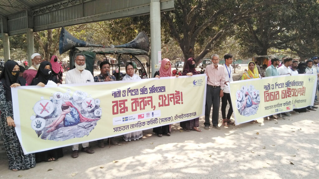 চাঁপাইনবাবগঞ্জে নারী ও শিশুর প্রতি সহিংসতা বন্ধসহ ১১ দাবিতে মানববন্ধন